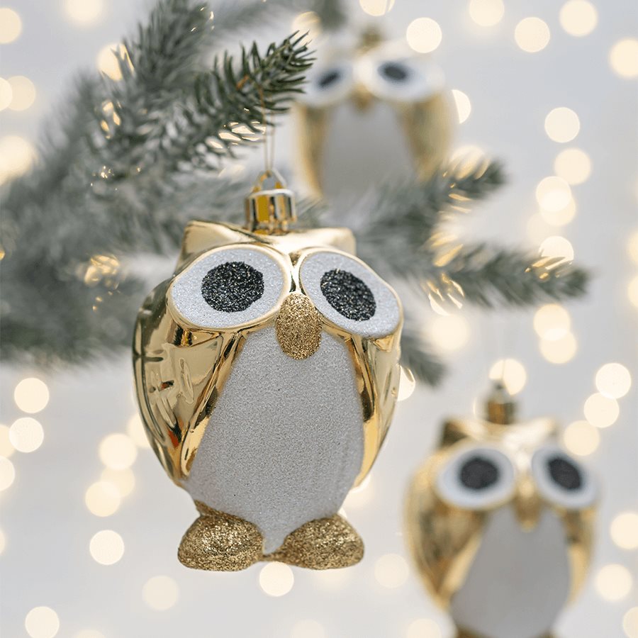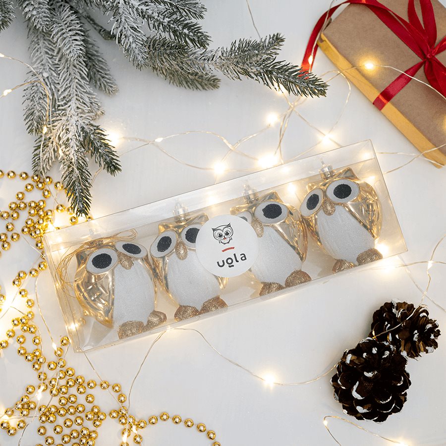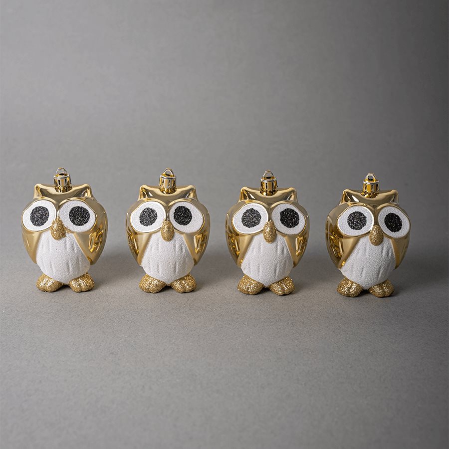 Набор новогодних елочных игрушек "Совята", светлое золото, 4 шт.,10 см., пластик
