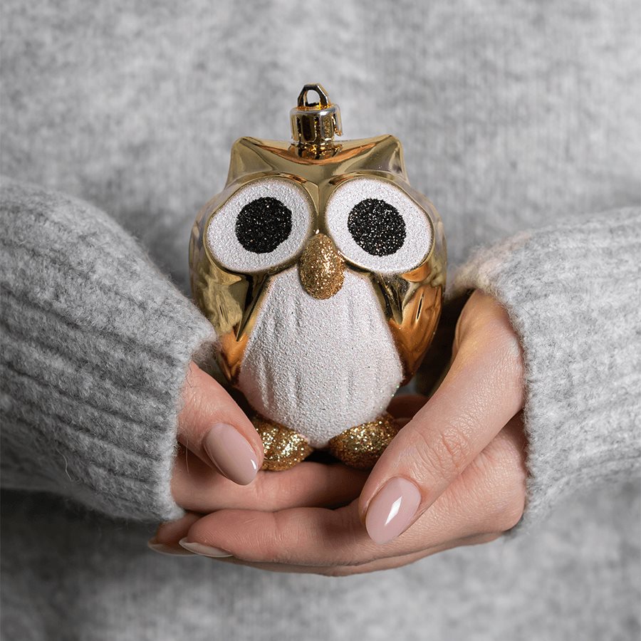 Крылья, ушки и спинка покрыты золотым глянцем. Белый блестящий животик с золотым клювом и лапками, которые также усыпаны мелкими блестками, создают контраст новогодних цветов. В этом сочетании совята выглядят красивыми и нарядными. Большие глазки очень трогательны и завершают милый образ.